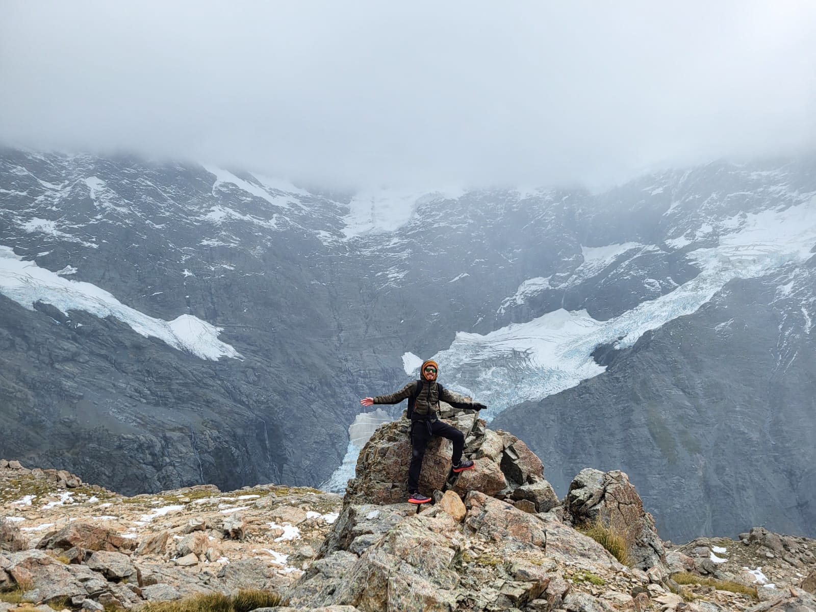 Le sommet donne vu sur le glacier Mueller dans la montagne. On le voit, il est là, tout prêt. Ce blanc éclatant sur le pan de la montagne ombragée, mystique. Qu’on est petit dans ce monde de géant.