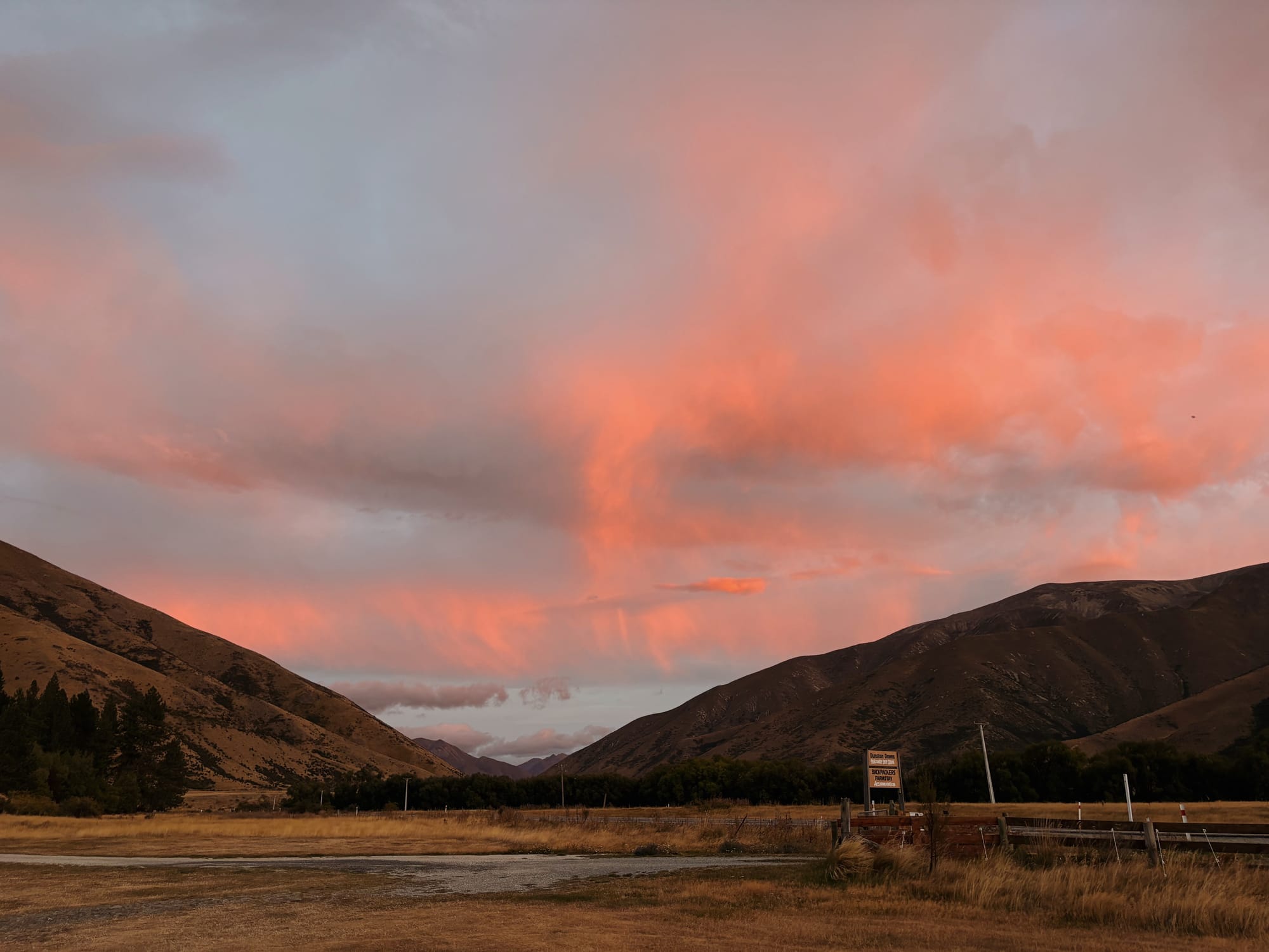 Journée terminée, direction l’auberge à 1h30 du Mont Cook. Aucune auberge à proximité du Mont Cook, tourisme oblige, c’est cher. On prend donc la route vers une ferme / auberge avec l’impératif de faire le check-in avant 20h. Arrivé prévu à 19h53, large. On se foire de route, pas de réseaux, petit coup de stress. On se débrouille et on arrive enfin à destination, ouf. C’est pas ce soir qu’on dormira dans la voiture.