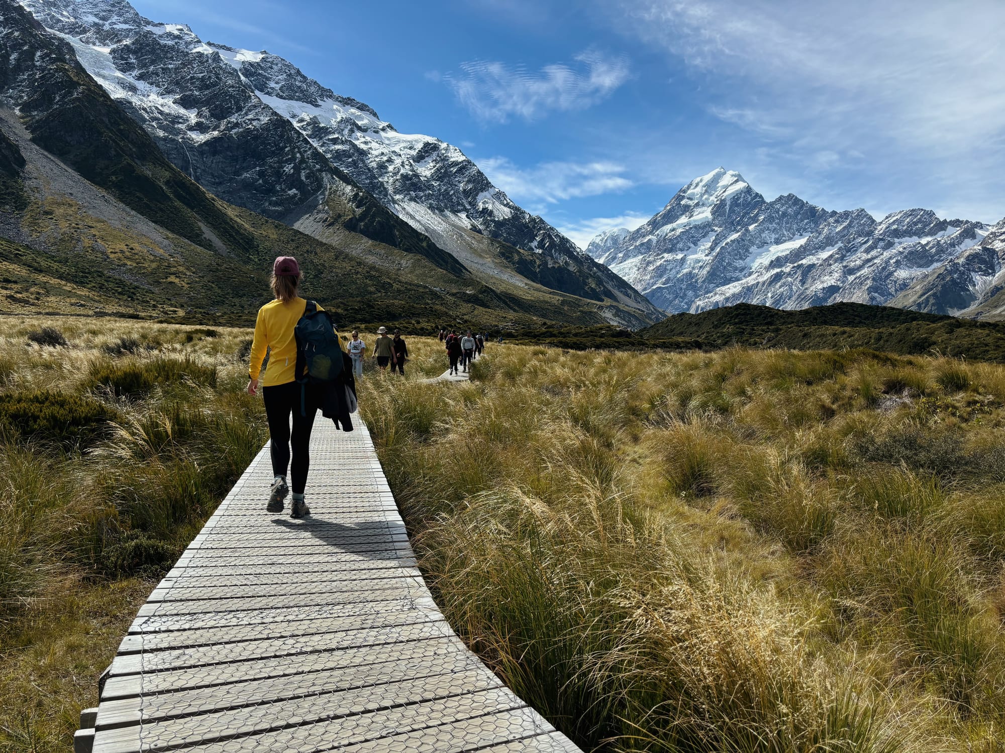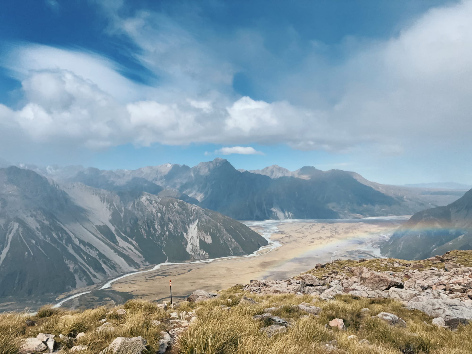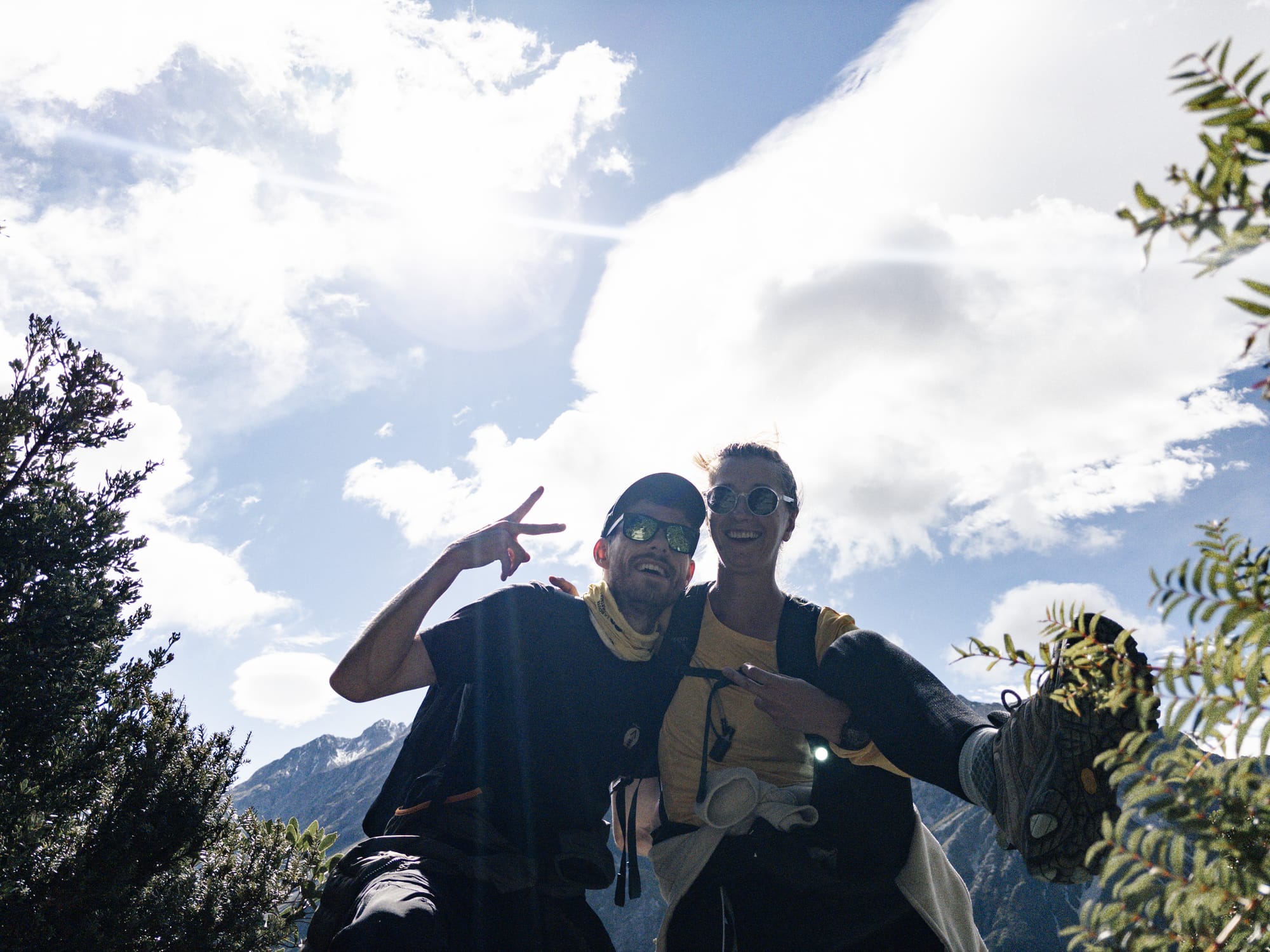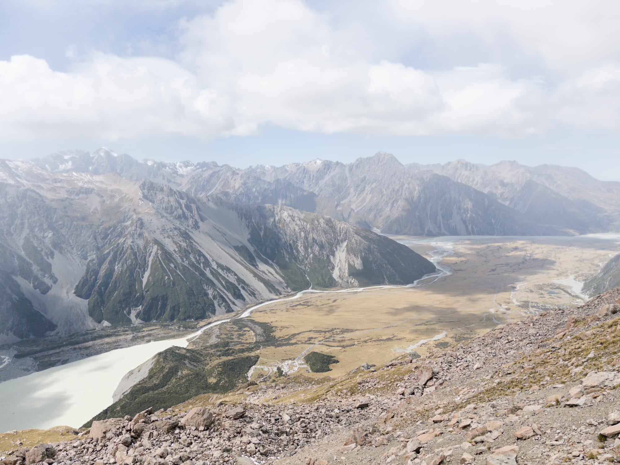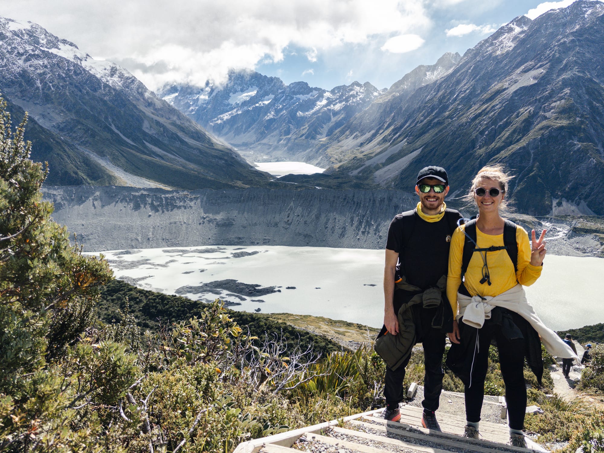 En descendant on fait une courte pause déjeuner caché derrière un rocher pour nous protéger des éléments ! Pas grand monde dans cette randonnée, ça change d’hier. On descend pile poile à temps, la pluie commence à se faire sentir. Les sommets des montagnes entourants le mont Cook disparaissent progressivement derrière des épais nuages, contents d’avoir pu en profiter plus tôt.