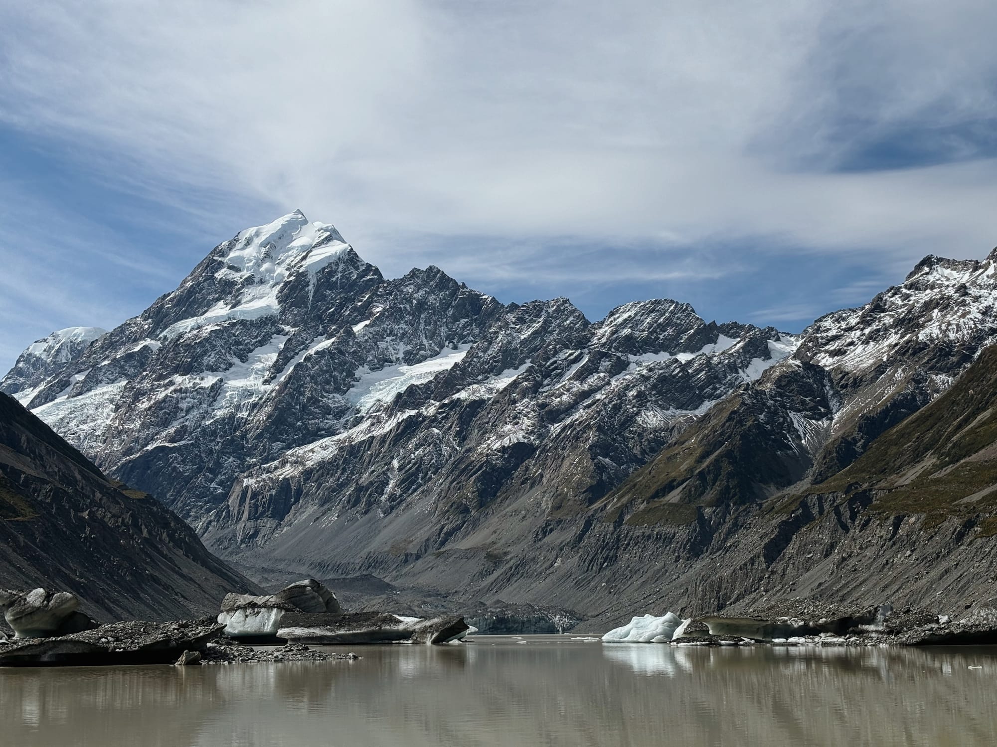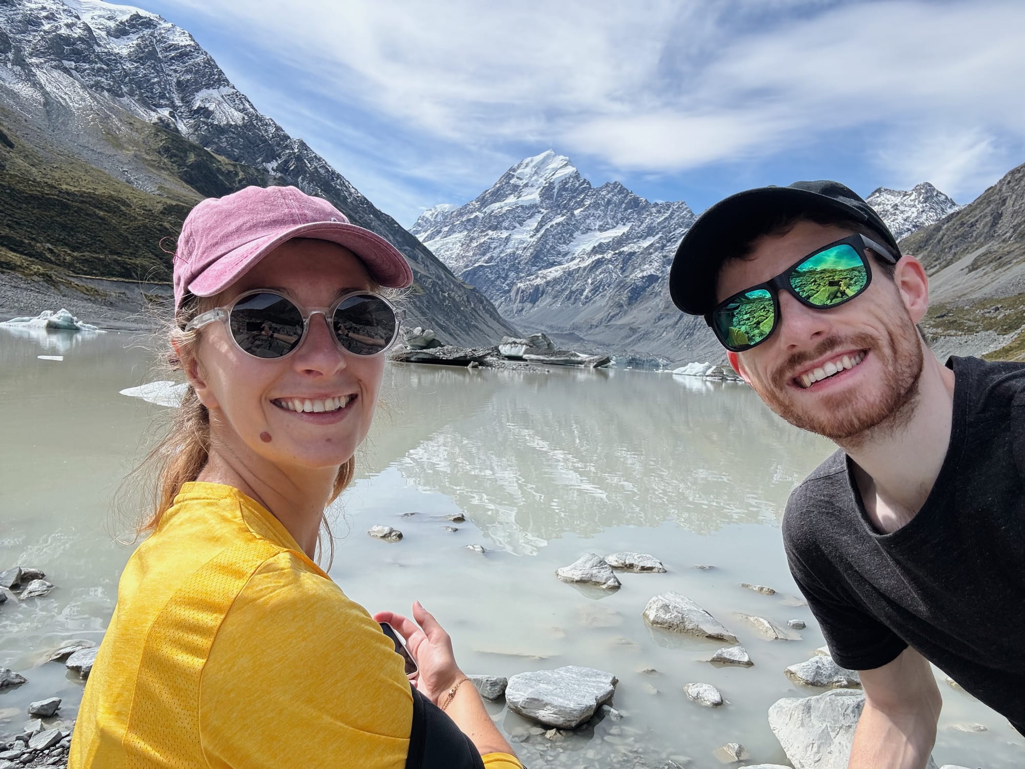 Deuxième rando, Hooker Valley Track. Plus longue que la deuxième, celle-ci nous permet de voir le glacier Hooker. On peux aller tout proche du lac et toucher son eau glacé. De petits icebergs flottent à proximité, c’est beau. Lors de gros tremblement de terre, comme en 2011 à Christchurch, de gros morceaux de glaces peuvent se détacher du glacier et provoquer un tsunami avec des vagues de 3 mètres, impressionnant. Les deux randos sont assez touristiques et on y croise pas mal de monde mais on est super content d’avoir fait une première approche en douceur et de planter le décor de ce qui nous attend le lendemain.